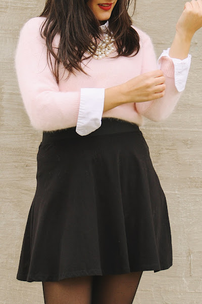 Lo combiné con una falda negra que suelo ponerme bastante porque, no sé por qué, tenia claro que quería ponerme falda. Los botines negros me los puse para... ¿sinceramente? no pasar frío. Sí, los stilettos son ideales pero vivo en Salamanca y hay que ser realistas. Rompen un poco la estética del conjunto porque no contribuyen al toque preppy de la camisa y las perlas, pero curiosamente me gusta el resultado. Y, bueno, las perlas a mí nunca me pueden faltar.
