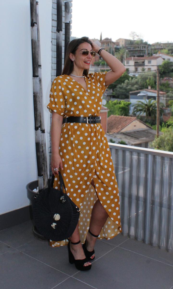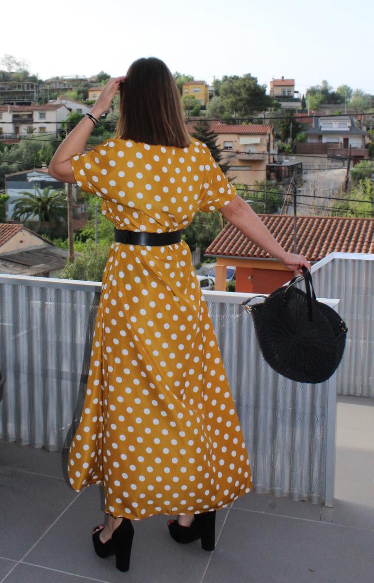 Realmente no es que se parezcan demasiado, pero son esas prendas que evocan recuerdos. En este caso el color no es marrón sino mostaza ( sin dudarlo el color de la temporada), salpicado con bonitos lunares. Largo por la parte trasera y acortándose por la delantera en forma de cruzada, escote en pico y media manga. Perfecto para estos días en los que el calor empieza a apretar pero todavía nos da reparo sacar las piernas al sol completamente.