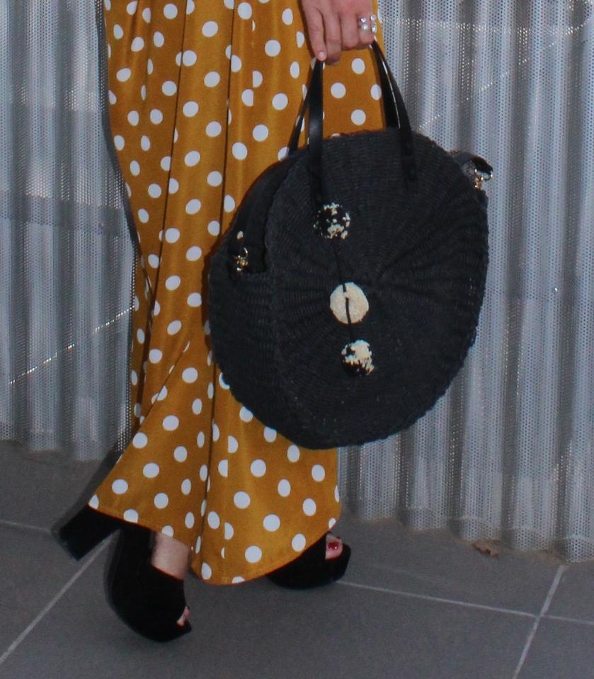 Como complemtentos elegí sandalias negras de plataforma y un bolso redondo de mimbre, sencillo pero muy vistoso.