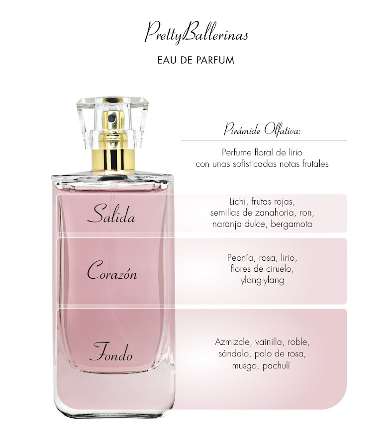 PrettyBallerinas Eau du Parfum, es un perfume floral de lirio con unas sofisticadas notas frutales. El lirio o Iris es el corazón de la fragancia, representa los efectos del material más rudo como el ante y la piel, y en torno a él se ha construido todo un mundo sensorial. La presencia del color rosa se traduce en unas notas llenas de alegría muy sofisticadas y frutales derivadas de la fresa, la frambuesa y los frutos rojos.