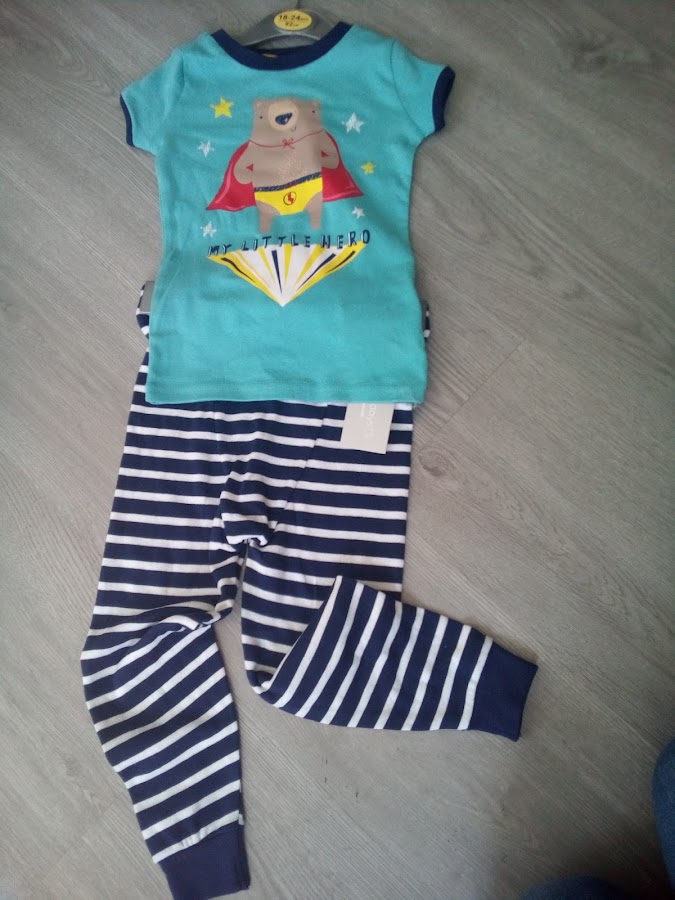 Para mi hijo me pareció muy gracioso este pijama de pantalón a rayas azules y blancas y esa camiseta tan molona de super héroe. Aunque así visto no cuadra la talla del pantalón tan largo con la camiseta tan corta... no sé, ya se lo probaré. Su precio es de 7€.