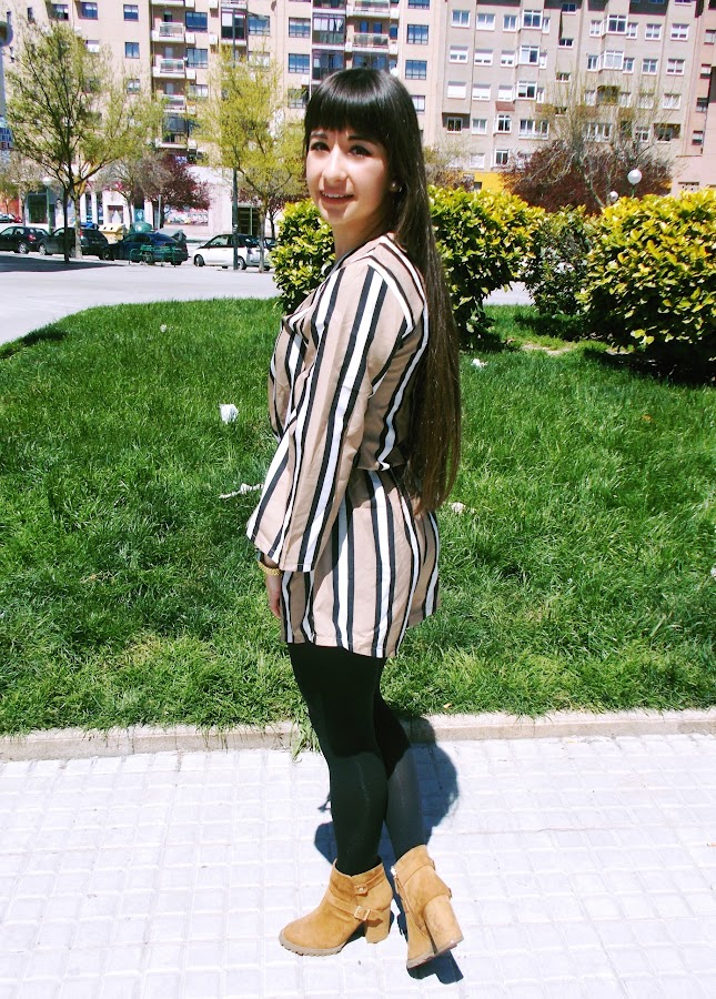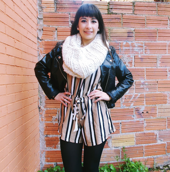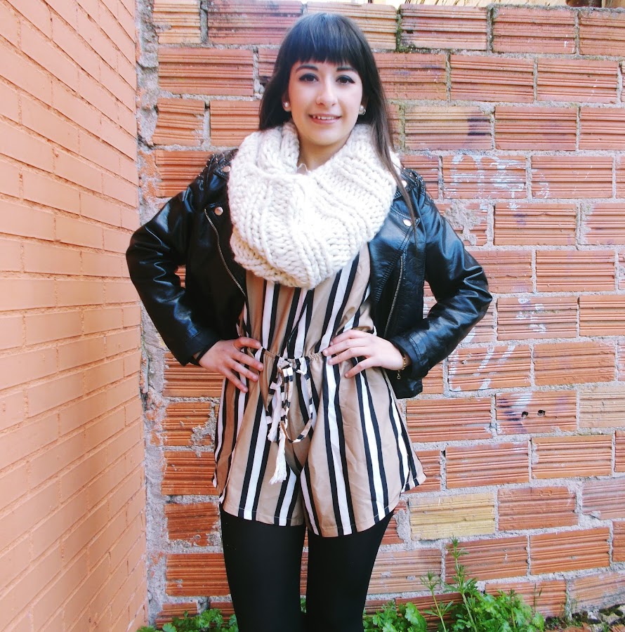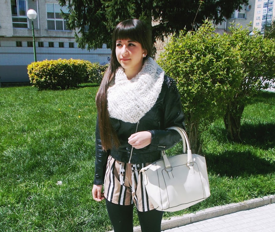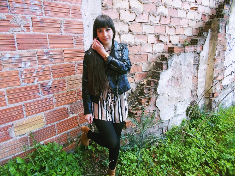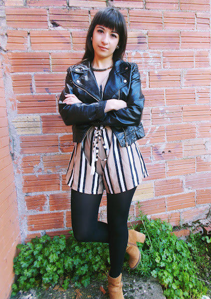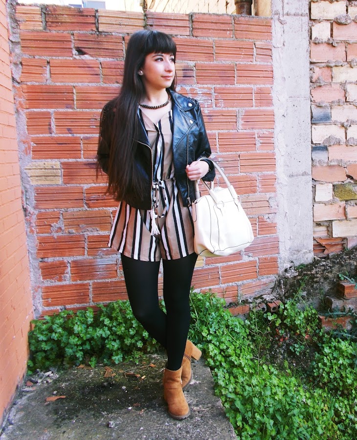 Hoy mi apuesta es más primaveral, ya que es la temporada en la que estamos. He combinado el mono o "jumpsuit" con biker negra, botines de ante, bolso clarito y medias negras.