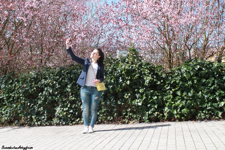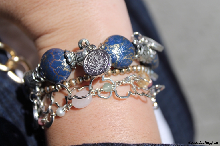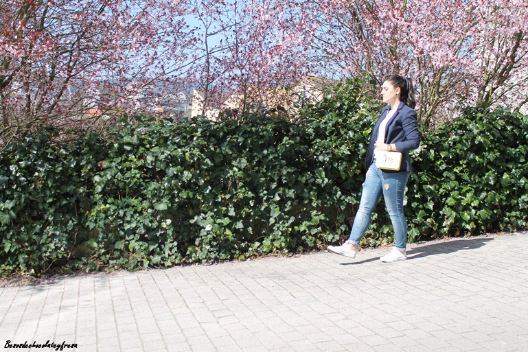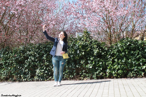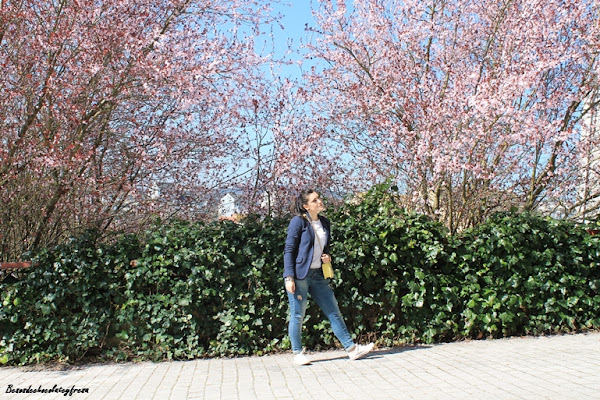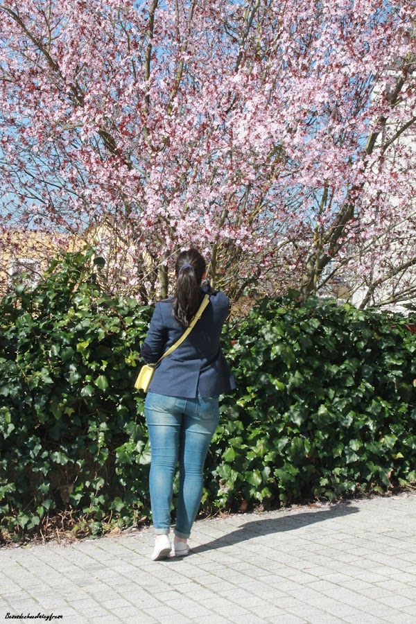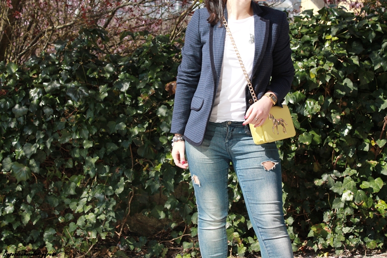 Para esta ocasión llevo un look cómodo y relajado pero con un toque chic al llevar blazer en azul marino y de cuadritos. La combiné con jeans, camiseta básica con el detalle de una mariposa, converse, complementos en azul como la pulsera (regalo de un amigo que me trajo de Istambul) y lazo en el pelo y para darle luz y color, bolso en amarillo de Minueto.