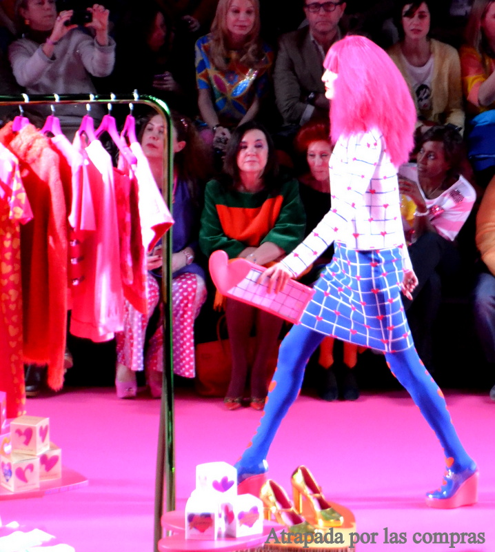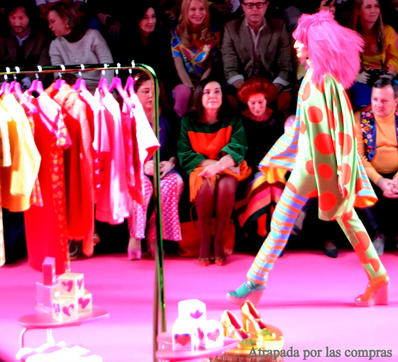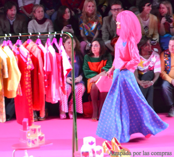 Siempre me imaginaba que un desfile de Ágatha Ruiz de la Prada tenía que ser un desfile alegre, divertido y cargado de optimismo y no me equivocaba. Lo primero destacar la alfombra rosa que cubría la pasarela en favor de la ONG Plan Internacional y su campaña "Por ser niña" que lucha para mejorar las condiciones de vida de 65 millones de niñas que no pueden ir a la escuela. Una alfombra que decoró con numerosos artículos que podemos encontrar en sus tiendas. Comienza el desfile y con él un conocido tema de Locomía, las modelos con una peluca rosa, que también lucía Cósima, hija de Ágatha, comienzan a salir a la pasarela con colores alegres, vibrantes, los estampados más representativos de la firma, unos psicodélicos y otros en formas de corazón o nubes, vestidos largos, monos, pantalones palazzo, faldas e incluso sudaderas, una colección que aporta comodidad y alegría a la mujer que decida vestirse con su ropa. Para terminar y al ritmo de la canción "No controles" del grupo Olé Olé, Ágatha Ruiz de la Prada salió a saludar como si de una modelo más se tratase con una de sus pelucas rosas. Sin duda un chute de optimismo y de buen rollo.