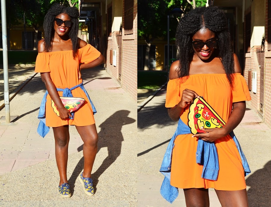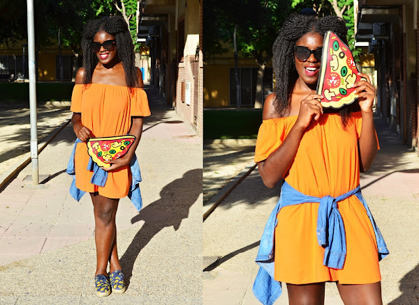 Pizza clutch+ vestido+gafas: ASOS (new) / Camisa vaquera: Stradivarius (old) / Alpargatas: Primark (new)