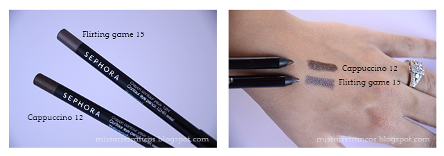 * Y por último dos perfiladores de ojos de la línea waterproof. Muy cremosos, duraderos y preciosos. El Flirting game 15, un marrón topo shimmer que combina a la perfección con la Satin Taupe de MAC. Y el Cappucino 12, marrón intenso con glitter.