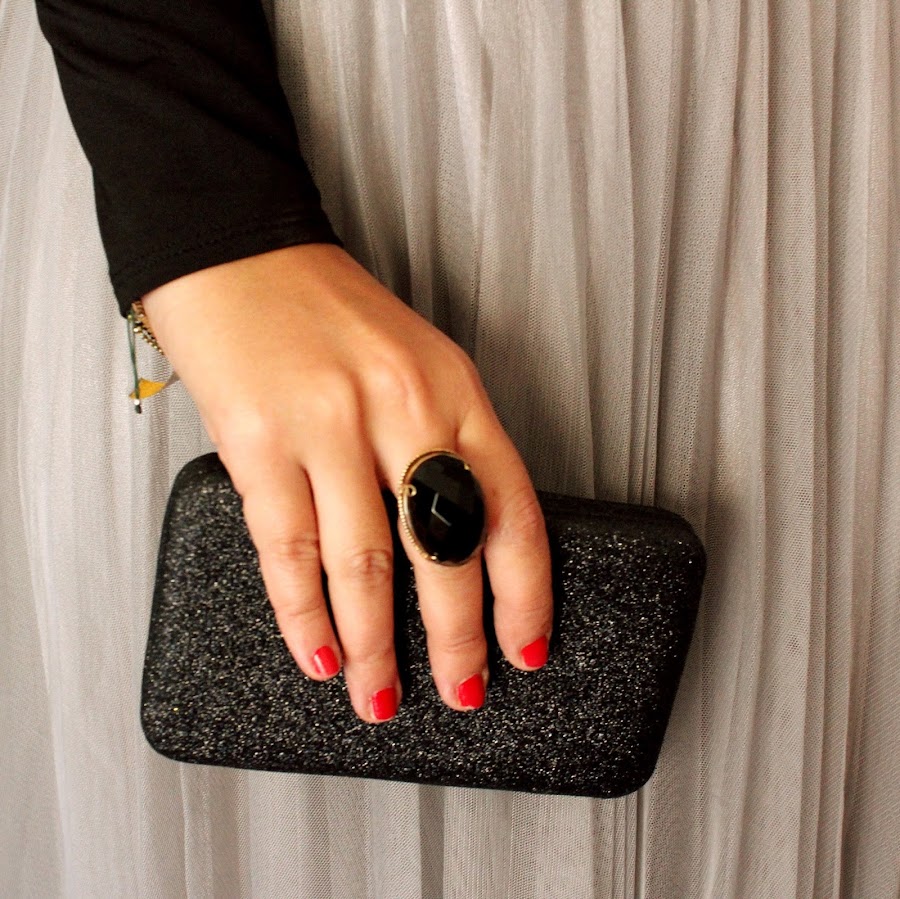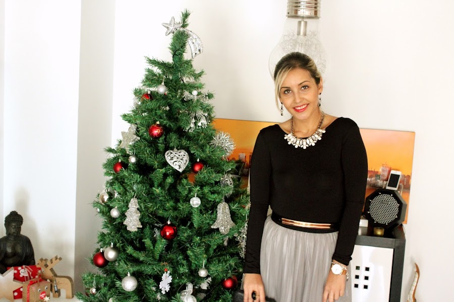 Hacía tiempo que quería una falda de tul y no me atrevía a hacerme con ella, pero al ver esta en color gris clarito, me pareció perfecta para estas fiestas. La combiné con un body negro con espalda descubierta y unas sandalias negras. Por último añadí un cinturón para marcar la cintura, un collar joya y un clutch negro con purpurina. Un look elegante con el que te sentirás como una princesa.
