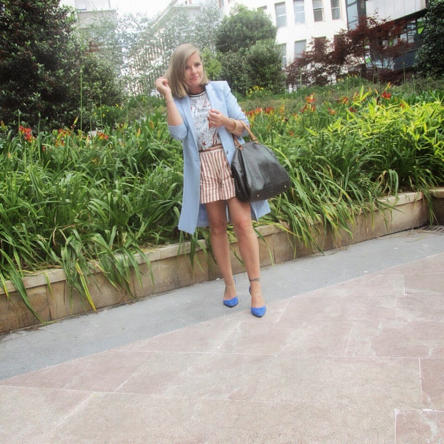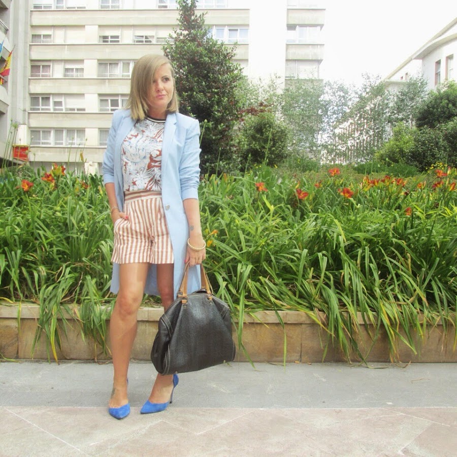 Respetando las tonalidades he combinado una blusa floral con shorts de rayas, una apuesta arriesgada pero que ya hemos visto muchas veces y que a mi personalmente me gusta un montón, ¿qué os parece?.