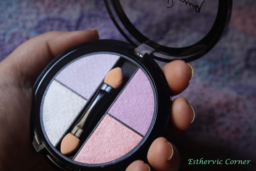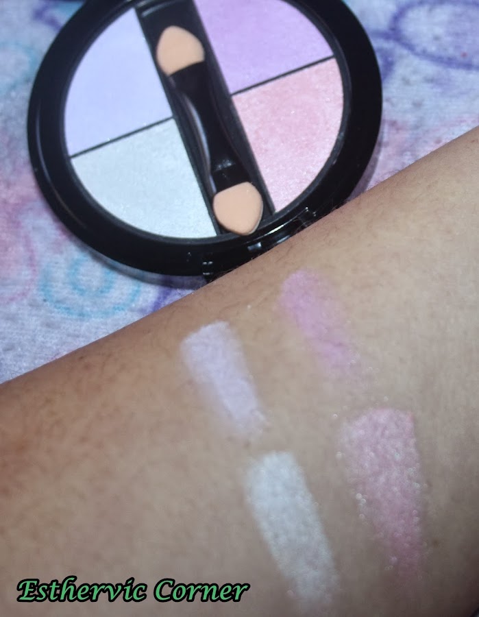 Cuarteto de sombras. Tonos muy claritos, perfectos para diario. Pigmentan bien, aunque un poco polvorientos. Como todos los productos de la marca tienen olor a talco. Asi quedan, con flash y sin flash: