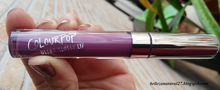 2-COLOURPOP ULTRA GLOSSY LIPSTICK: Este ha sido el primer producto que he probado y estoy enamorada de él. Es un labial tipo gloss con color que además de ser precioso, deja los labios hidratados, con una sensación muy agradable y nada pegajosa. El color es bastante intenso y su duración muy buena para ser tipo gloss. Lo apliqué por la mañana y lo llevé casi perfecto hasta la hora de comer, y digo casi porque con las horas fue disminuyendo un poco el brillo, pero el color siguió allí. El tono que elegí fue el "Master Plan" un color morado súper bonito y favorecedor. Aquí os dejo foto: