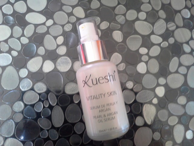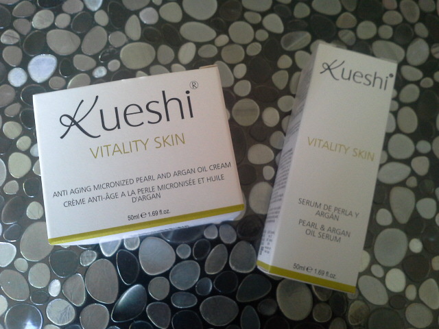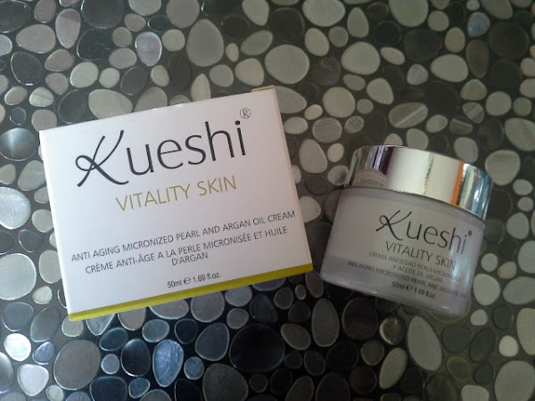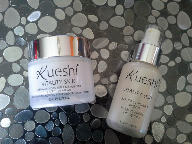 La gama Vitality Skin de Kueshi, es una línea de productos antiedad en la que sus principales componentes son la Perla micronizada (aporta luminosidad a la piel), los aceites de Argán y Rosa Mosqueta y la manteca de Karité (Regeneran y protegen).