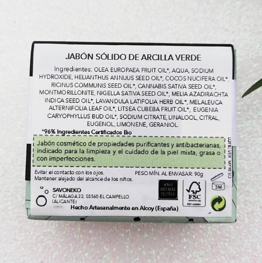 Se trata del Jabón Solido de Arcilla Verde de SAVONEKO. Un jabón cosmético de propiedades purificantes y antibacterianas, indicado para la limpieza y el cuidado de la piel mixta, grasa o con imperfecciones.