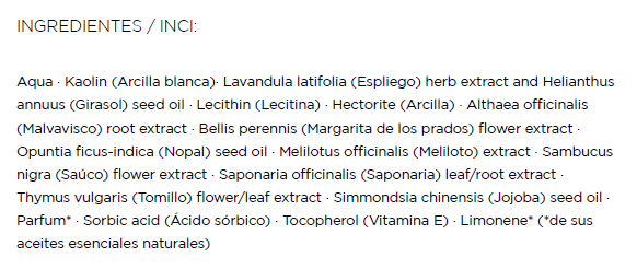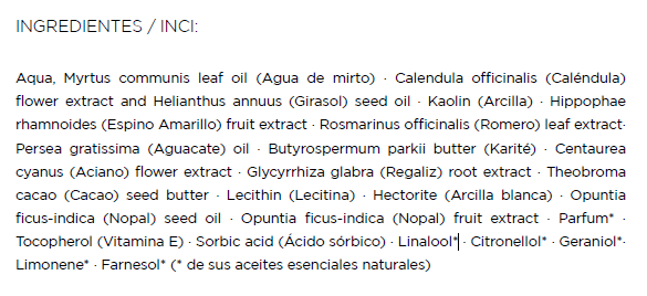 Es una mascarilla que aporta nutrientes y antioxidantes esenciales a tu piel, para purificarla y rejuvenecerla. Su textura es muy fluida y su aroma me gusta mucho, ya que está enriquecido de arcillas y nutrientes vegetales, que ayuda a eliminar los puntos negros y las células muertas de la piel.