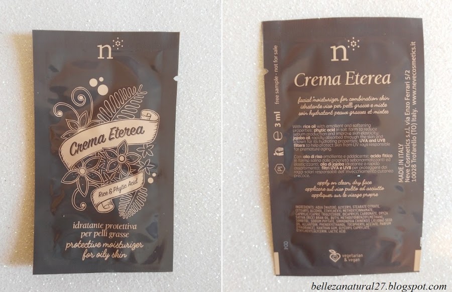La segunda muestra es una Crema Hidratante Facial para pieles grasas. Esta crema tiene una textura cremosa y un olor delicioso como a repostería. Se absorbe rápido y deja la piel hidratada y muy suave. En cuanto a los brillos, no es que los produzca, pero tampoco los controla, por lo que si tienes tendencia a brillar como una bombilla, esta crema no va evitar que sigas haciéndolo, aunque no te producirá más brillos. Es una crema que me ha gustado mucho, pero en mi caso necesito algo que me controle más el exceso de sebo de la zona T.