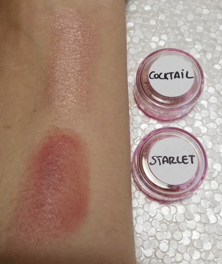 El pigmento con nombre COCKTAIL es un rosa pálido con muchos destellos. Es un pigmento muy luminoso y bonito. STARLET en cambio es un pigmento con un tono teja-rosado y acabado mate, muy favorecedor. Aquí los podéis ver mejor.