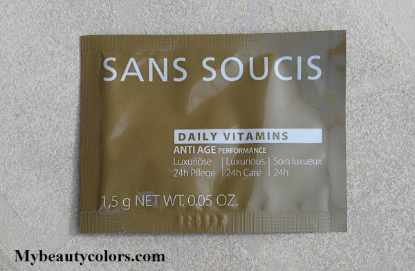 7-SANS SOUCIS DAILY VITAMINS ANTI AGE PERFORMANCE LUXURIOUS 24H CARE: Lujoso cuidado 24h con aceites preciosos aceites naturales, extracto de algas marinas, ácido hialurónico, palmitato de Vitamina A, acetato de vitamina E y aguas termales ricas en minerales de Baden Baden. Es un tratamiento especialmente adecuado para pieles maduras ya que favorece la elasticidad de la piel y la protege contra los nocivos radicales libres. El resultado es una piel hidratada, con tacto de terciopelo y bonita. No contiene Parabenos, aceites minerales ni ingredientes de origen animal. Dermatológicamente testada. Se utiliza por la mañana y por la noche sobre la piel limpia.