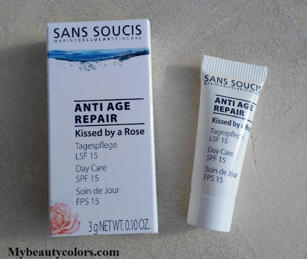 1-SANS SOUCIS ANTI AGE REPAIR KISSED BY A ROSE : Crema de día con SPF 15 con extracto de células madre de Rosa y Repair Complex. sus ingredientes concentrados tienen un potente triple efecto: antiarrugas, UV-REpair y protección celular. El extracto de células madre de Rosa mejora la vitalidad de las células madre de la piel ayudando a su renovación. De esta forma la piel queda protegida contra el estrés causado por los rayos UV. La piel está más hidratada y más firme. Su complejo de reparación activa el mecanismo de reparación de la piel y compensa las finas líneas y arrugas.