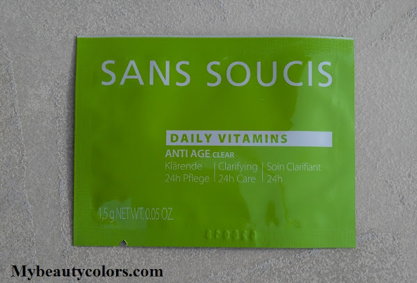6-SANS SOUCIS ANTI AGE CLEAR DAILY VITAMINS: Cuidado 24 horas con valiosos aceite kernel de albaricoque, extracto de limón, BioEcolia, palmitato de vitamina A y acetato de vitamina E, así como agua mineral termal de Baden Baden. Especialmente adecuado para pieles maduras con impurezas. Es un cuidado ligero que refina el tono de la piel, regula el exceso de sebo y deja la piel mate y con tacto sedoso. No contiene aceites minerales, parabenos ni ingredientes de origen animal. Dermatológicamente testado.