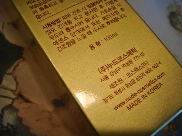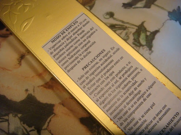 Si algo caracteriza a esta marca, es la elegancia de sus envases, muy al contrario de otras firmas corenas o asiáticas, que inundan de colorido y envases imposibles, el mercado. El packaging exterior es dorado, con letras en color marrón rojizo. Hermosas flores en relieve adornan la cajita de cartón reciclable de Moisture Essential Mist de Nudecos. Lleva una etiqueta en la que, en castellano, nos describen Modo de Empleo, Almacenamiento y Precauciones, relativos al producto.