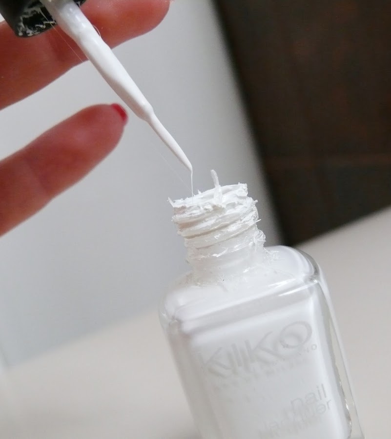 Esmalte blanco de manicura francesa - Kiko:Lo tengo desde hace un montón y a parte de que estaba en las últimas al final se me acabó secando. Me gustó mucho mucho, el pincel como veis es finito porque su función es la de hacer manicuras francesas aunque yo lo he utilizado para eso y también para la uña entera.