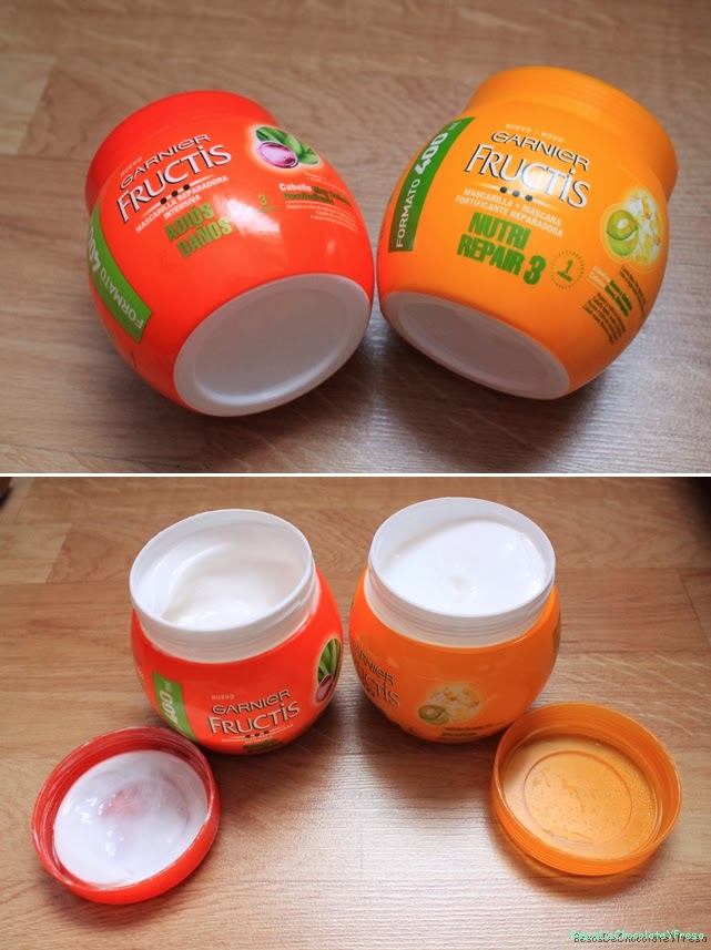 En cuanto a las mascarillas de la gama Fructis de Garnier, una es reparadora intensiva, adios daños para cabellos desvitalizados y la otra es fortificante reparadora, nutro repair para cabellos secos. Son frascos de 400ml cada uno y su precio ronda los 4?.