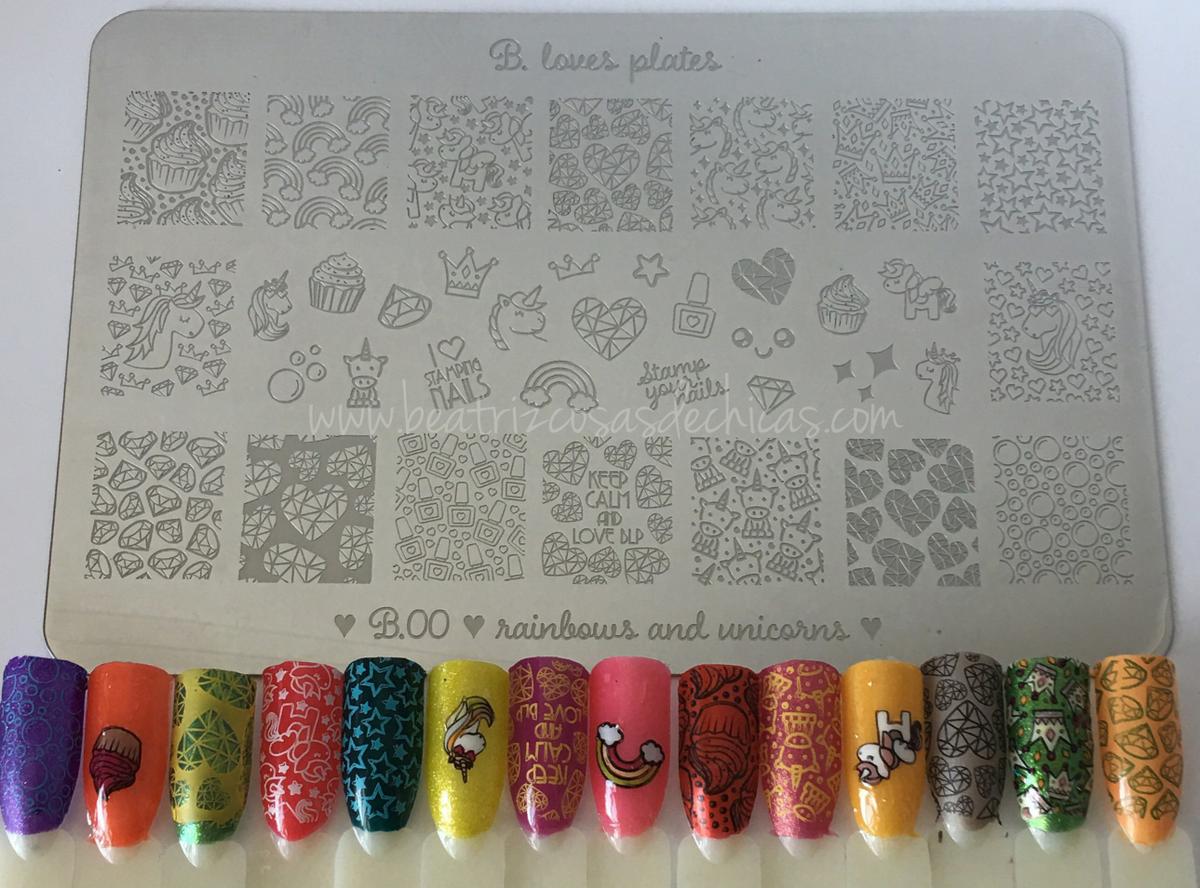 El Sello es: Estampador de Crystal Clear (transparente plástica de la manija + recarga claro), es muy suave y tiene un tamaño de 3,5cm. Los Esmaltes de Colour Alike son, Azul: BLP11 – B. un océano azul y Fucsia: BLP39 – B. un Flash de fucsia y bueno, para finalizar los productos os voy a presentar la placa mas cuqui del mundo mundial: B.00 – arcoiris y unicornios…RAINBOWS AND UNICORNS y para verla al detalle que mejor que unos SWATCHES de los que os gustan!!!!