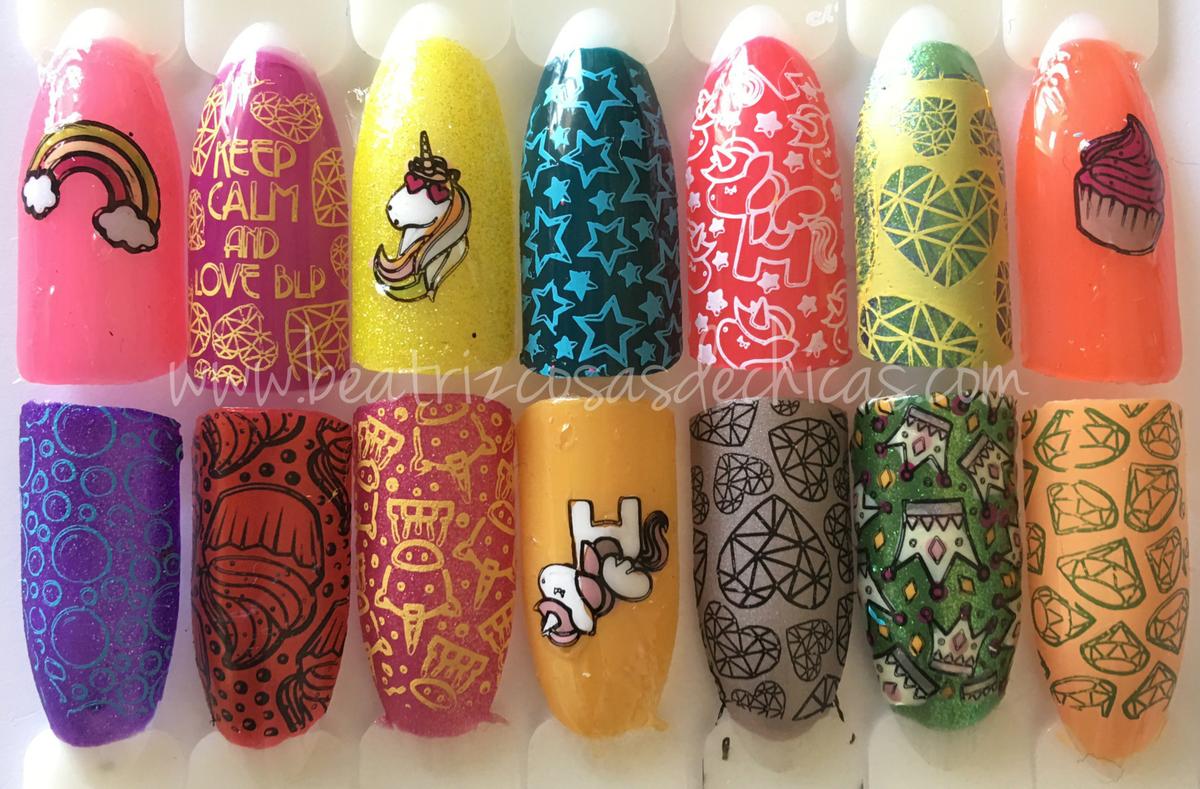 Que os parecen las muestras?!?!?! Bueno….impresionantes de bonitas! Tengo que decir que disfrute como una enana haciendo los reverses y de verdad…no se si serán los Unicornios, los Arcoiris, las Estrellas o que….pero cada vez que cogia la placa….me salia una sonrisa de oreja a oreja y claro…con tantas ganas cogí la placa que os tengo preparadas DOS MANICURAS! Si, si….a falta de una, DOS y todo…porque vosotras lo valéis!