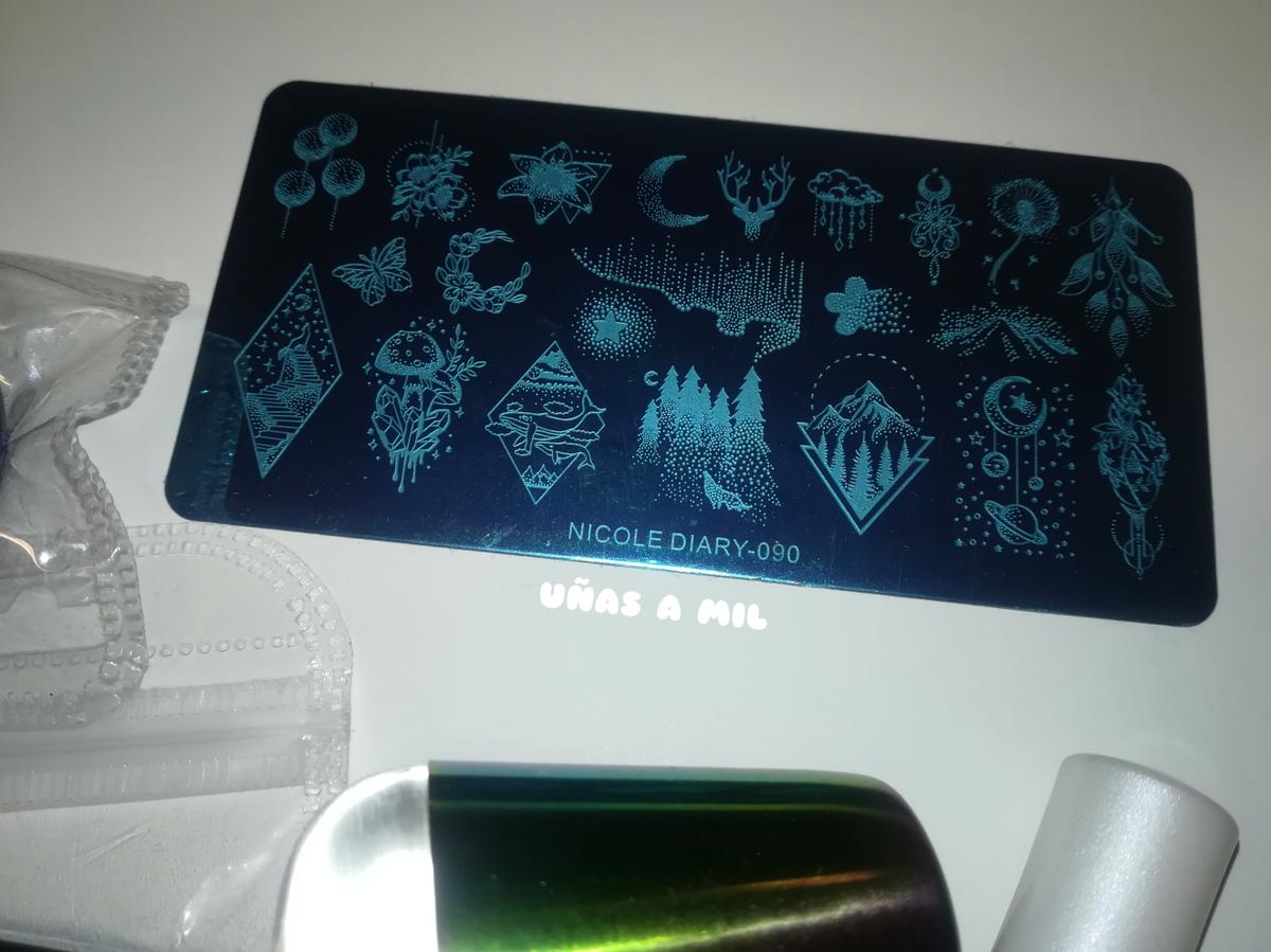 Como podéis observar, se trata de una placa de estampación con diseños muy originales de lunas, satélites, bosques…, también un estampador transparente para poder ver donde aplicar el diseño en la uña, porque el que tenía ya era viejito y necesitaba otro, me ha gustado mucho porque es grande y me viene genial cuando llevo las uñas súper largas.
