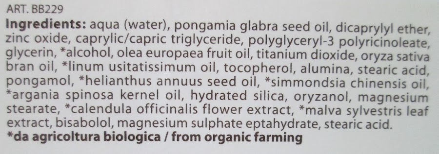 Ingredientes: Aqua, *Malva sylvestris leaf water, *Calendula officinalis flower extract, *Helianthus annuus seed oil, Inulin, Alpha-glucan oligosacharide, Lactic acid, *Melaleuca alternifolia leaf oil, Coco-glucoside, Benzyl alcohol, Dehydroacetic acid, Potassium sorbate, Sodium benzoate, Limonene.