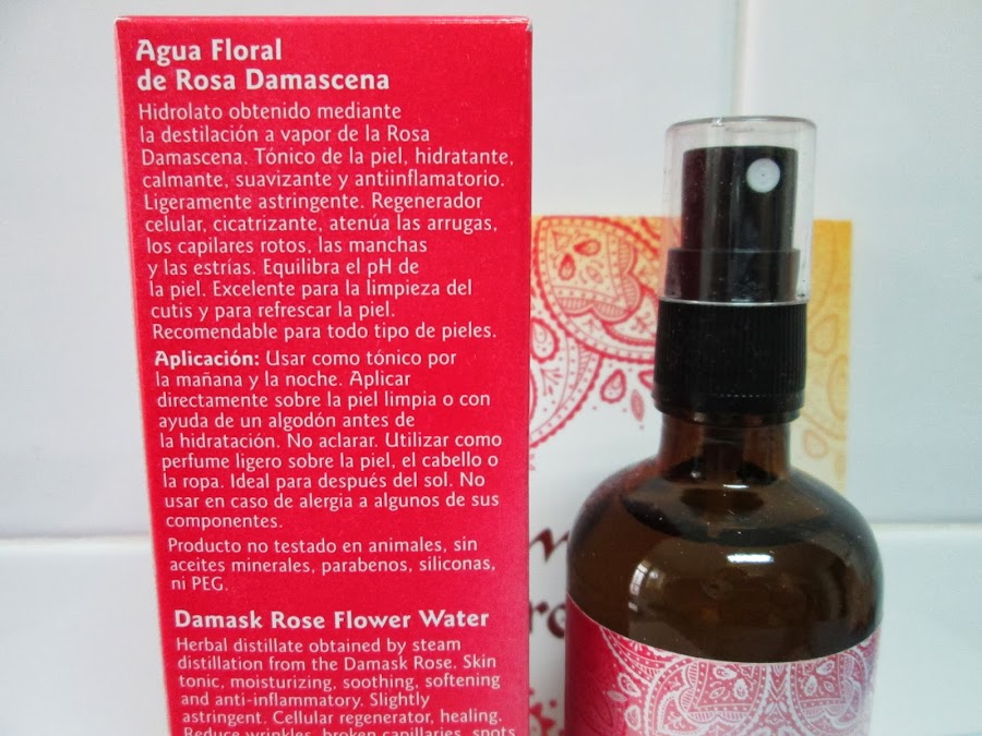 Y por último, os presento este agua floral de rosas. Yo soy una amante de los hidrolatos, me encantan como tónico, porque refresca, calma e hidrata la piel de maravilla.