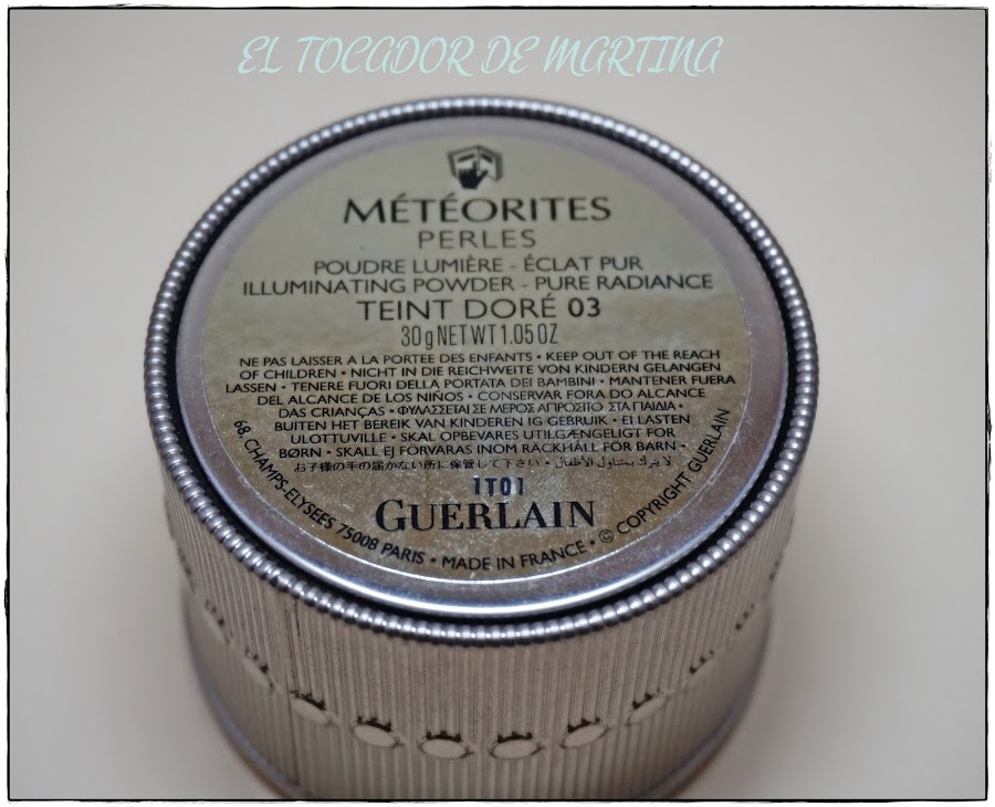 ¿Y qué son exactamente los meteoritos? Pues bueno, podemos encontrar meteoritos en diferentes tonos, pero salvo el caso de algunas ediciones limitadas que han lanzado en diferentes momentos y que asemejan tonos de blush, en la gran mayoría de los casos se trata de un producto iluminador de acabado, es decir, no es tanto para usarlo en zonas concretas sino para aplicarlo por todo el rostro, ya que su efecto iluminador realmente no es tal, sino que es un reflector de luz, por lo que podemos usarlo como producto de acabado al finalizar nuestro maquillaje. Hay tres tonos y yo elegí el 3, teint doré, porque creo que es el que más se adapta a mi tono de piel:
