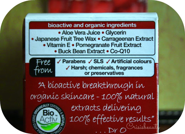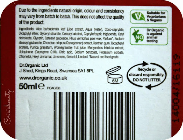 Hablemos de los ingredientes:como veis en la foto de abajo, está libre de parabenos, siliconas, colorantes articiales, químicos duros, aromas y conservantes. Entre sus ingredientes activos presenta aloe vera, vitamina E, extracto de Granada, coenzima Q10... además de un montón de extractos de frutas. El resto de los ingredientes son muy seguros y de buena calidad segun la web biodizionario. Debido al origen natural de sus ingredientes, el envase advierte de que el color y la consistencia de la crema puede variar de un lote a otro.