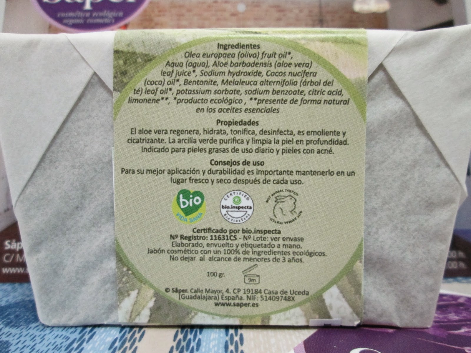 El primer producto que os enseño, se trata del "Jabón de Arcilla Verde", el cual es ideal para pieles mixtas-grasas. Se presenta envuelto en un papel muy bonito, y trae 100 gramos de cantidad, con una caducidad de 9 meses.