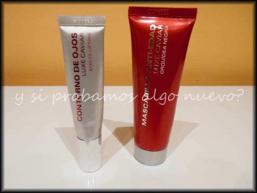 Estos dos son del mercadona, de la línea Luxe caviar. El contorno de ojos no noté nada especial mientras lo usaba. La mascarilla me dejaba una sensación que no me gustaba nada y me irritaba los ojos. No voy a repetir con ninguna de las dos.
