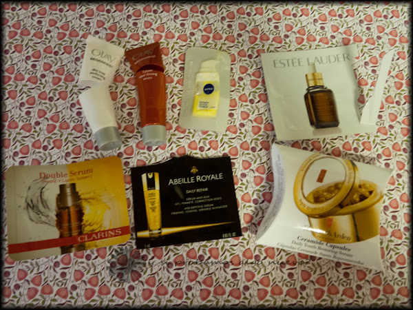 Las primeras son todo muestras. La de Elisabeth Arden hice una review aquí, sigo pensando igual que entonces, me han encantado, si pudiera me las compraba, de momento no me lo puedo permitir. Las de Olay también me han gustado, es posible que compre el tamaño venta, son asequibles y me gusta su textura. Las otras cuatro son sérums ( bueno excepto la blanca de Olay), en general me han gustado bastante, la de Clarins me ha resultado un poco rara porque son dos líquidos y se mezclan al echarlas, pero claro en la muestra es un poco difícil de hacer. La que no me ha gustado nada es la de Nivea, no sé si ha sido porque la muestra no sale nada bien, igual el bote de venta se usa mejor pero en esta muestra era casi imposible. La textura queda con las bolitas rotas y es grumosa, no me ha gustado nada y no creo que la compre.