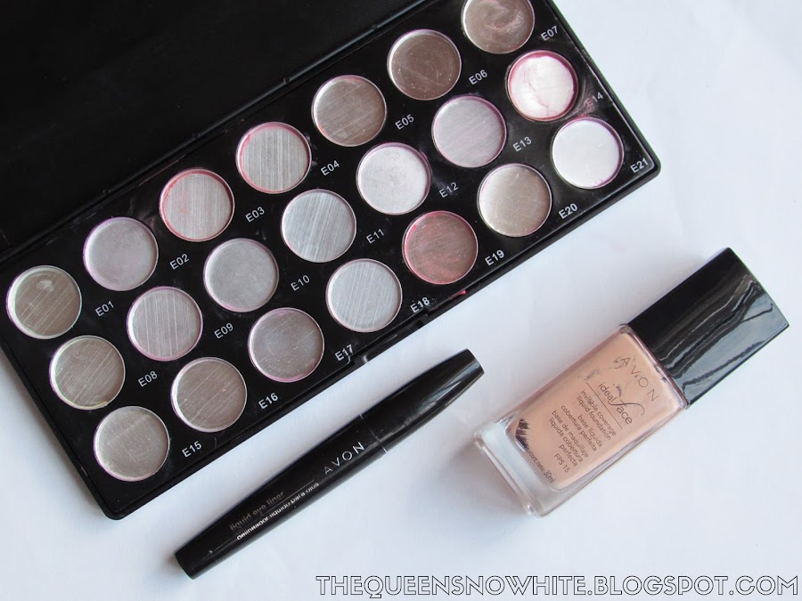 Estos primeros tres productos ya se los había mostrado en el último post del Project Pan (Aparte: no subí la actualización de julio puesto a que estuve -y estoy- con exámenes y no me maquillé demasiado en este tiemo). Consisten en la paleta de glosses de Born Pretty Store, el delineador líquido marrón de Avon y la base Ideal Face de la misma marca.