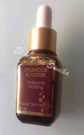 El siguiente producto terminado del que os voy a hablar es del Splendor Booster de Heber Farma. Los booster como ya sabéis aumentan la eficacia de los productos que se aplican sobre ellos. Este en particular tiene la característica de fijar el maquillaje consiguiendo que dure más tiempo a la vez que ilumina la piel. A mi me ha ido estupendamente en las ocasiones especiales que quería que me aguantara intacto el maquillaje más tiempo y como todo booster ayuda a que se absorban mejor los activos de los cosméticos que aplicamos a continuación por lo que nuestra piel se mantiene más hidratada.