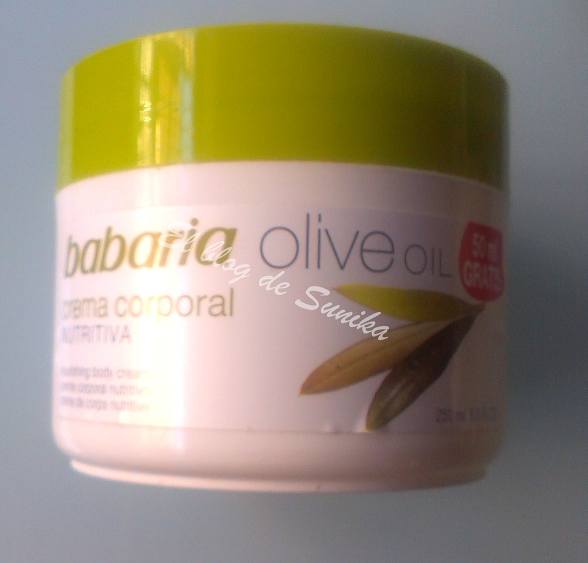 Ahora os voy a hablar de una crema corporal al aceite de oliva que me ha gustado mucho, es de Babaria. Puedo decir que me ha encantado, se extiende de maravilla y mantiene la piel muy hidratada. La encontré en una perfumería local al increíble precio de 1 euro y estamos hablando de un bote de 200 ml, no lo podía dejar pasar y la verdad es que fue un chollo porque no puedo estar más contenta de como ha funcionado esta crema. No es nada pringosa y se absorbe muy bien, lo único que lleva algo de parafina, es lo que menos me ha gustado. Por lo demás la veo totalmente recomendable para quien busque una buena crema hidratante.