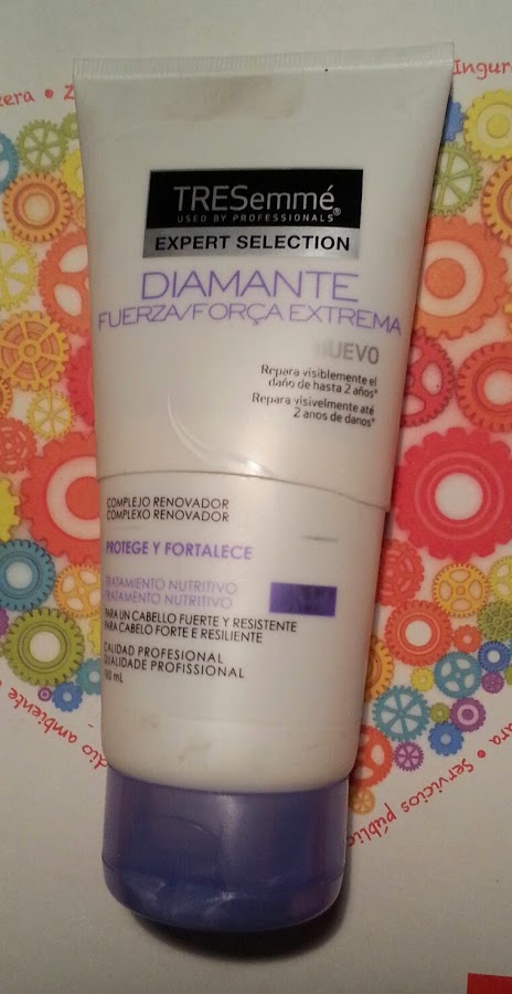 5) TRESemmé, tratamiento nutritivo diamante fuerza extrema: Esto si que es una castaña. Ni repara, ni nutre, ni nada, esto solo enguarra el pelo. Yo tengo el cabello más seco del mundo mundial, pues con esto igual de seco y dañado pero con las raíces grasas... lo que yo necesitaba vamos... el único producto que me ha provocado grasa en el pelo. Como mucho mucho para usarla solo en las puntas pero yo necesito hidratación en todo el cabello y si subes un poco el producto te lo engrasa. Trae 180 ml y cuesta 5"50?. No repetiría ni de broma.