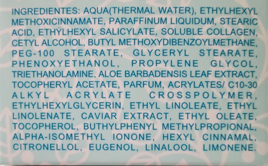 Es una crema rica en aguas termales y caviar, que ayudan a aportar a la piel la hidratación que necesita. Lo que más me ha gustado de ella, a parte de su olorcito tan suave, fresco y agradable, es que contiene protección solar 15.