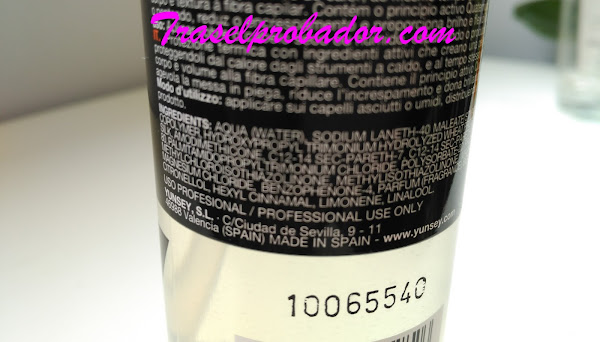 Este protector del calor viene en un envase de plástico con aplicador en forma de spray. Contiene 200 ml y lo podréis encontrar en tiendas de productos profesionales de peluquería. Concretamente yo lo compré en Discastillo (aquí) y me costó 5.85 €. Como veis, está genial de precio. De esta casa he probado varios productos de peluquería y suelen tener una calidad genial y a buen precio, lo cual me ayudó a la hora de decantarme por este protector.