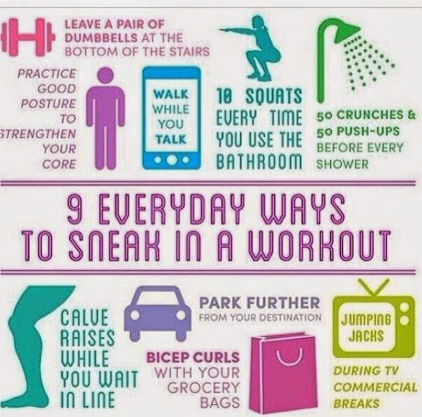 I know that not everybody can exercise everyday, so I found very interesting these 9 Everyday Ways to Sneak in a Workout image I found on the Internet and that I wanted to share with you.