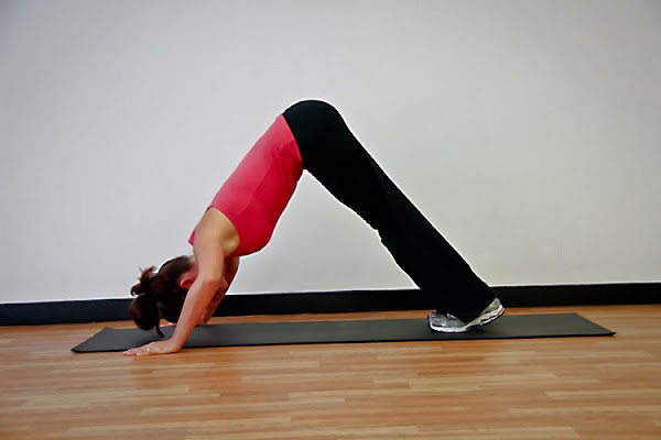 Si lo que queremos es trabajar los hombros, en lugar de levantar pesas o hacer chin ups, podemos usar la postura del perro boca abajo, como en esta foto, y simplemente flexionar y estirar los codos para subir y bajar: