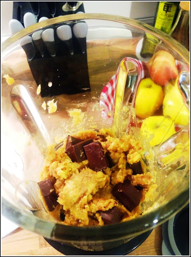 En una batidora de vaso potente (y lo digo porque la mía acabó echando un poco de humo), mezclamos todos los ingredientes excepto el chocolate. Hay que ir poco a poco, mezclando con una cuchara de vez en cuando para unir todos y despegar la mezcla de las paredes del vaso de la batidora.