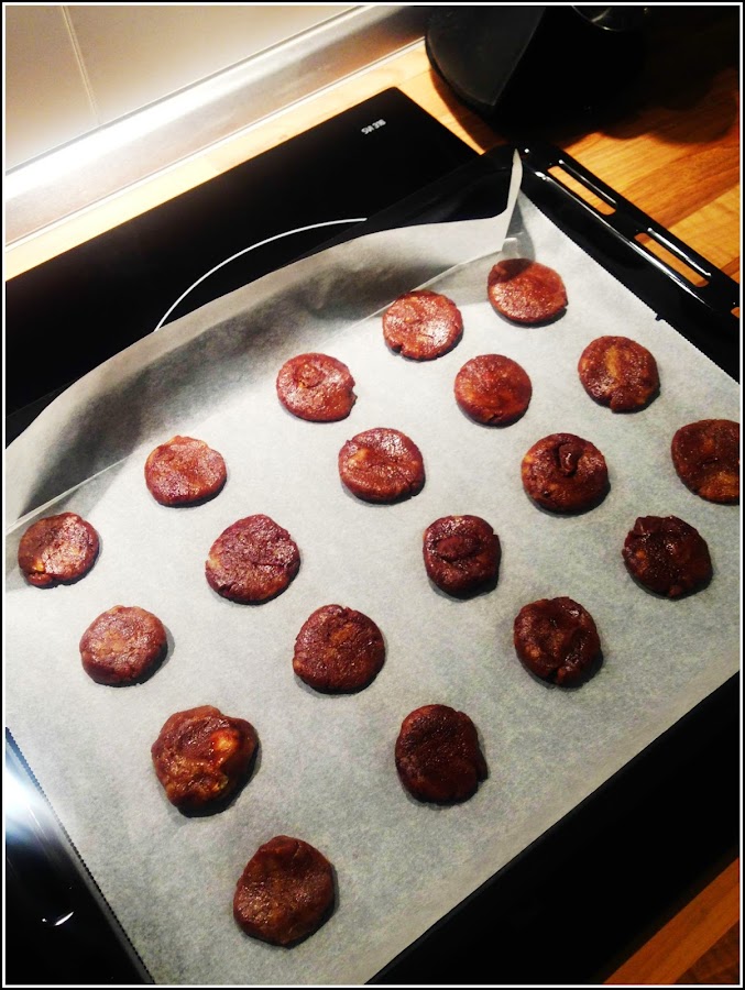 Colocamos las galletas en una fuente de horno con papel para hornear. No hace falta dejar espacio porque no crecen apenas, así que podéis darle un tamaño grande si las preferís así. Yo las hice pequeñitas y se comen de dos bocados, cosa que me parece más cómoda, y me salieron unas 25 galletas.