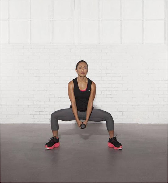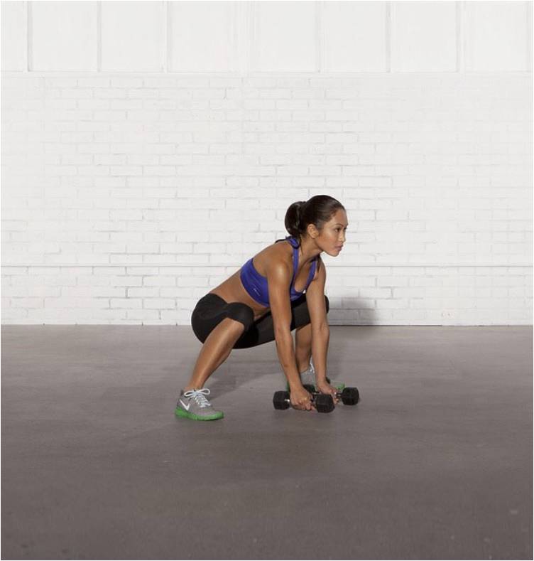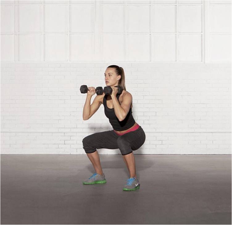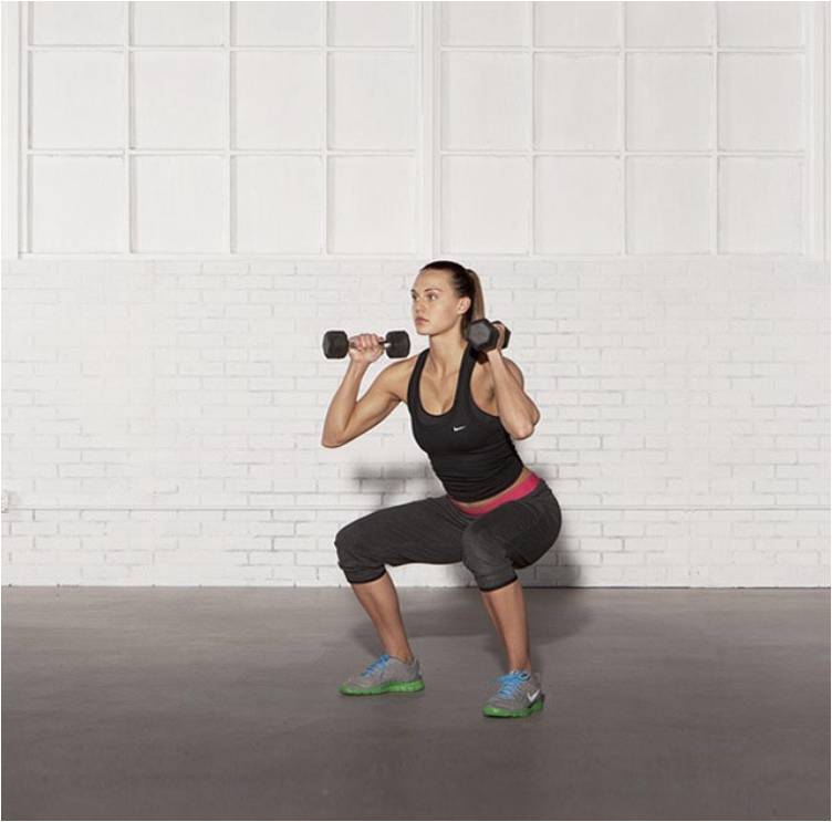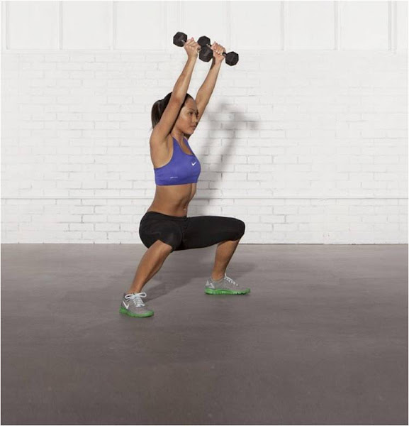 -Sentadilla con Press y Rotación: con las mancuernas sobre los hombros con los brazos flexionados, hacemos una sentadilla. Al estirar las piernas estiramos los brazos al mismo tiempo que giramos el tronco hacia un lado. Bajamos a la sentadilla de nuevo flexionando los codos y al subir hacemos el giro hacia el otro lado. Repetimos 12 veces a cada lado. No hace falta que os diga lo que trabajan en este ejercicio los cuádricpes, los glúteos y los hombros. También trabajan los oblícuos y los lumbares.
