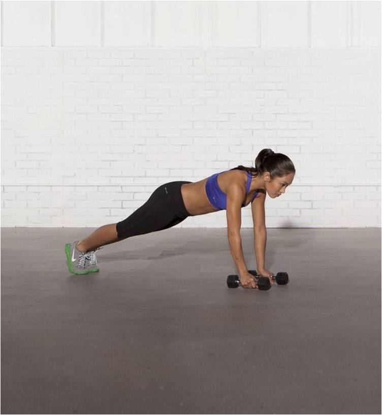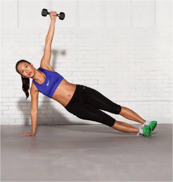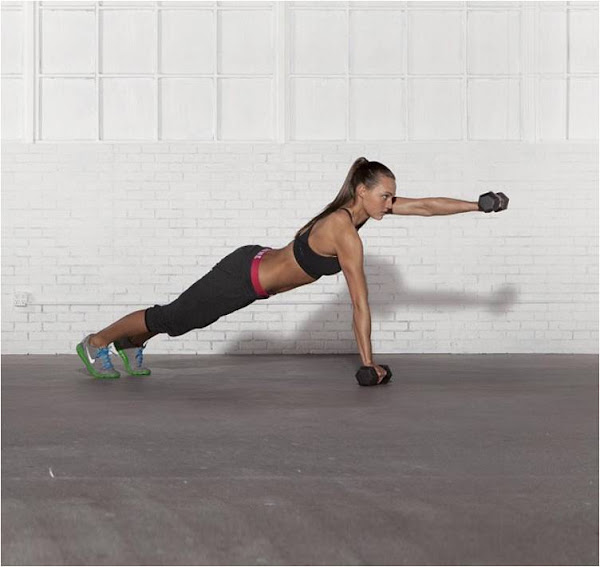 -Side Plank with Reverse Fly (si alguien sabe cómo se llama este ejercicio en español sin traducirlo literalmente, que me lo diga). Partiendo de una plancha lateral, levantamos el brazo que no está apoyado en el suelo -obvio- estirado por delante del cuerpo hasta llegar a formar una T. Lo bajamos sin que llegue a tocar el suelo, y repetimos el movimiento 15 veces. Cambiamos de lado y hacemos otras 15 repeticiones. Este ejercicio trabaja los abdominales, los oblícuos, y los hombros. Y también el sentido del equilibrio. Puede que las primeras veces tendáis a caeros hacia adelante, pero eso se soluciona apretando mucho los abdominales.