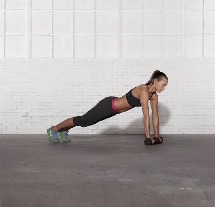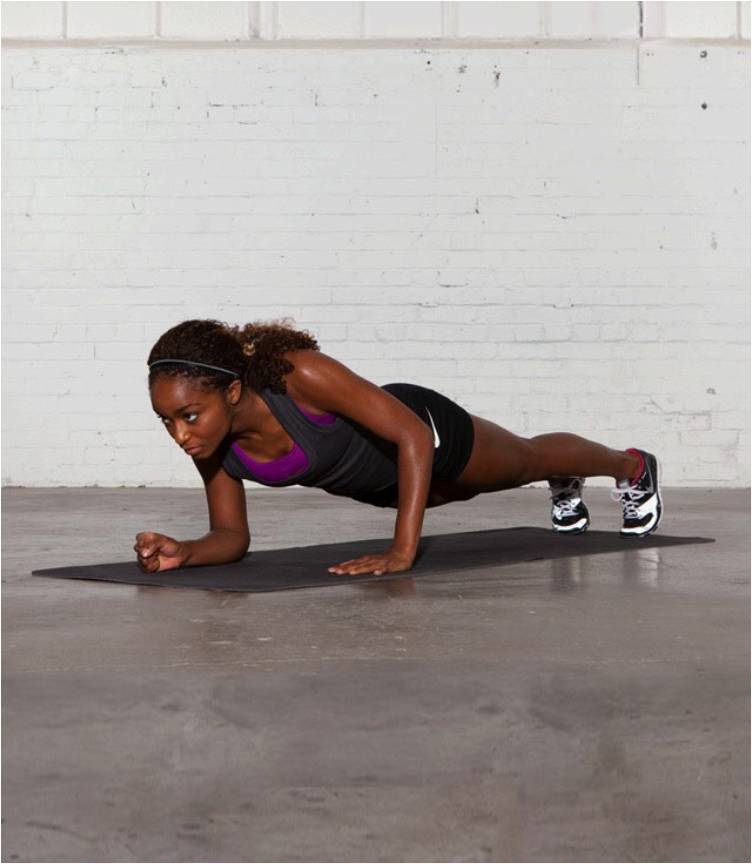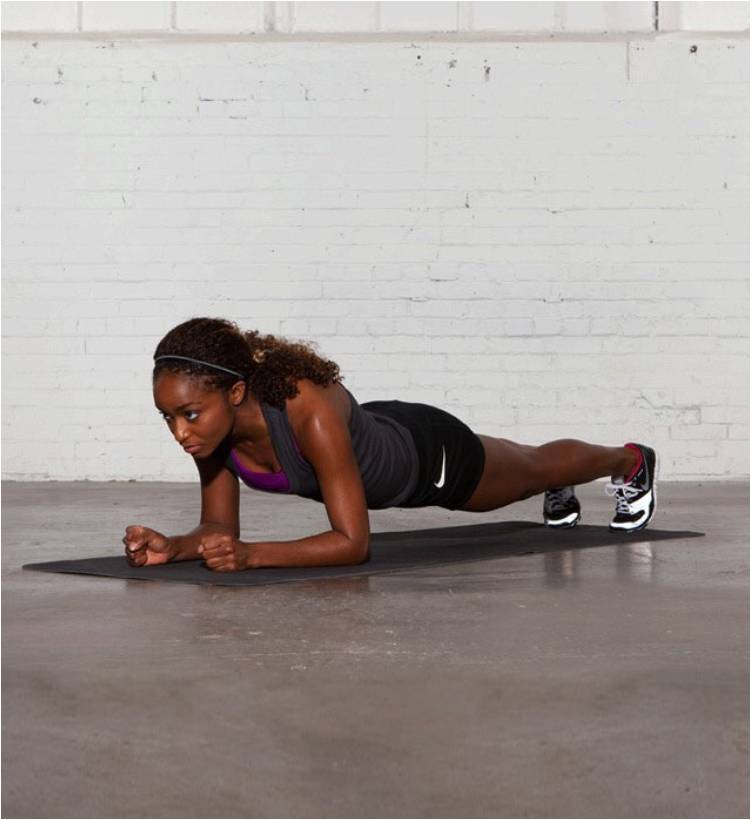 -Planchas Caminando: Partimos de la posición de plancha (manos y pies apoyados en el suelo, cuerpo recto, abdominales contraídos) y desde ella apoyamos el codo derecho primero y luego el izquierdo para hacer una plancha con los antebrazos apoyados en el suelo. Volvemos a la posición inicial y repetimos el movimiento un minuto (son unas 15 repeticiones). Este ejercicio cansa mucho los abdominales y los hombros, pero es muy, muy bueno. Un truco para hacerlo más llevadero es contraer los cuádriceps. Y recordad mantener siempre la espalda recta y no balancear las caderas.
