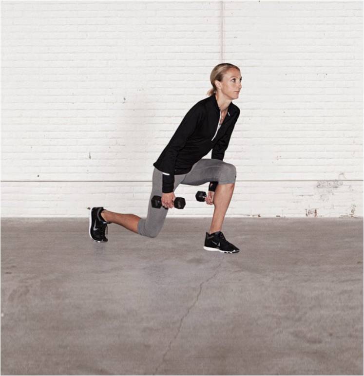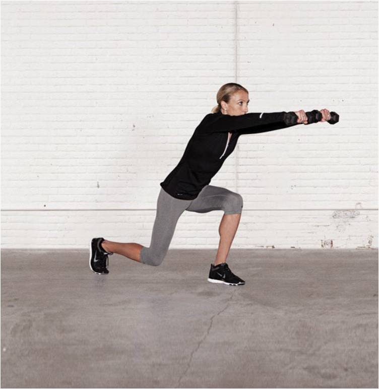 -Lunges con Elevación Frontal: Hacemos un lunge, como se ve en la imagen inicial, y manteniendo la postura levantamos los brazos extendidos hacia el frente. Bajamos los brazos. Repetimos el movimiento, sin cambiar la posición de las piernas, durante 30 segundos con cada una de ellas. Trabajaremos piernas, glúteos, abdominales y brazos.