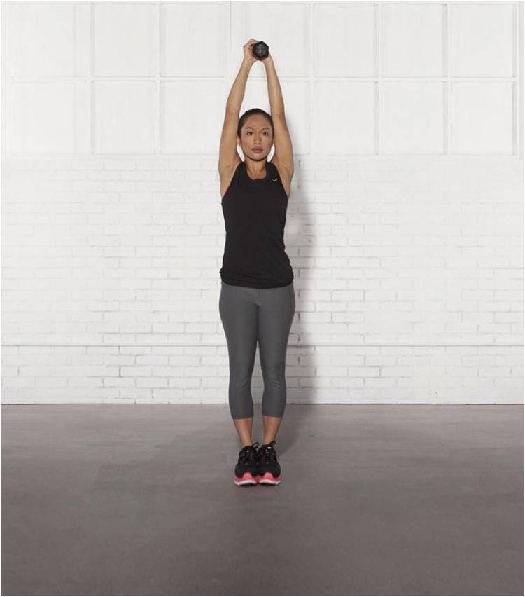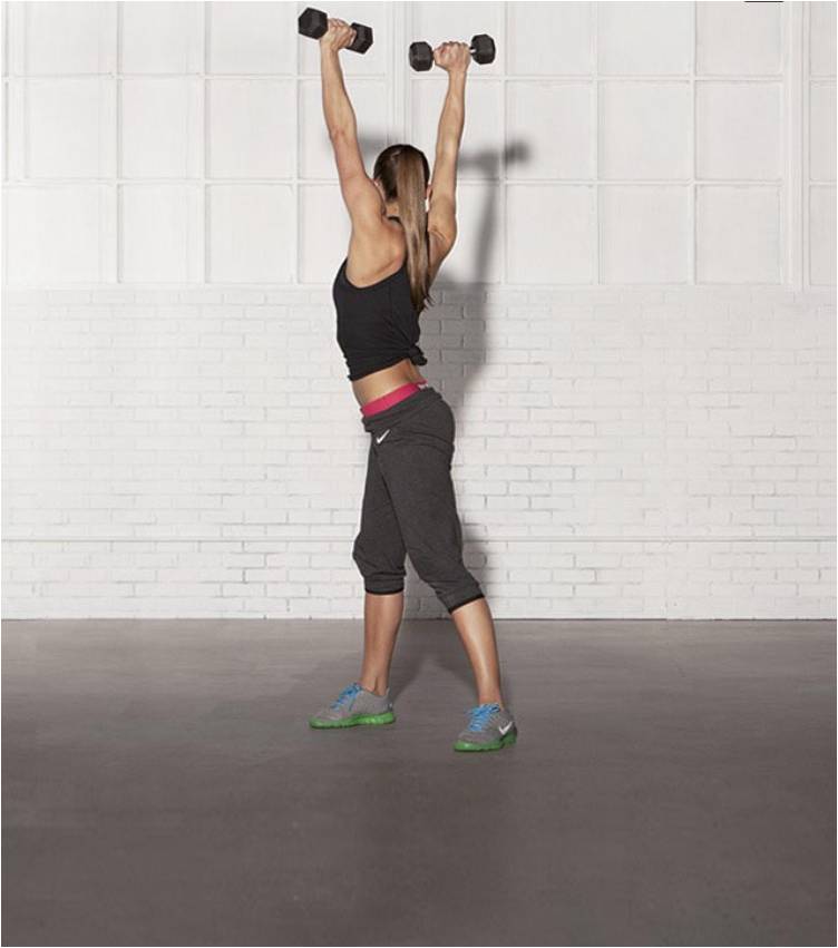 -Saltos de Rana a Press de Hombros: desde la posición de plancha, pasamos a un salto de rana y en esa postura, contrayendo los abdominales para no arquear la espalda, levantamos los brazos por encima de la cabeza con las mancuernas. Bajamos los brazos al suelo y de un salto echamos las piernas hacia atrás para volver la posición inicial de plancha. Repetimos durante un minuto (10 o 12 repeticiones). Aquí sobretodo notaremos el trabajo en los cuádriceps y en los hombros, pero también trabajan os abdominales, la espalda y los lumbares.